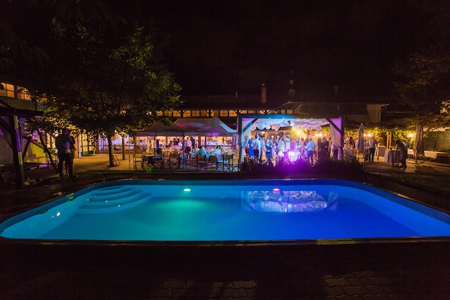 A medence egy forró nyári esküvő után vonzó "célpont" lehet a tánctér mellett. A fotó a szigetmonostori Rosinante Fogadóban készült.